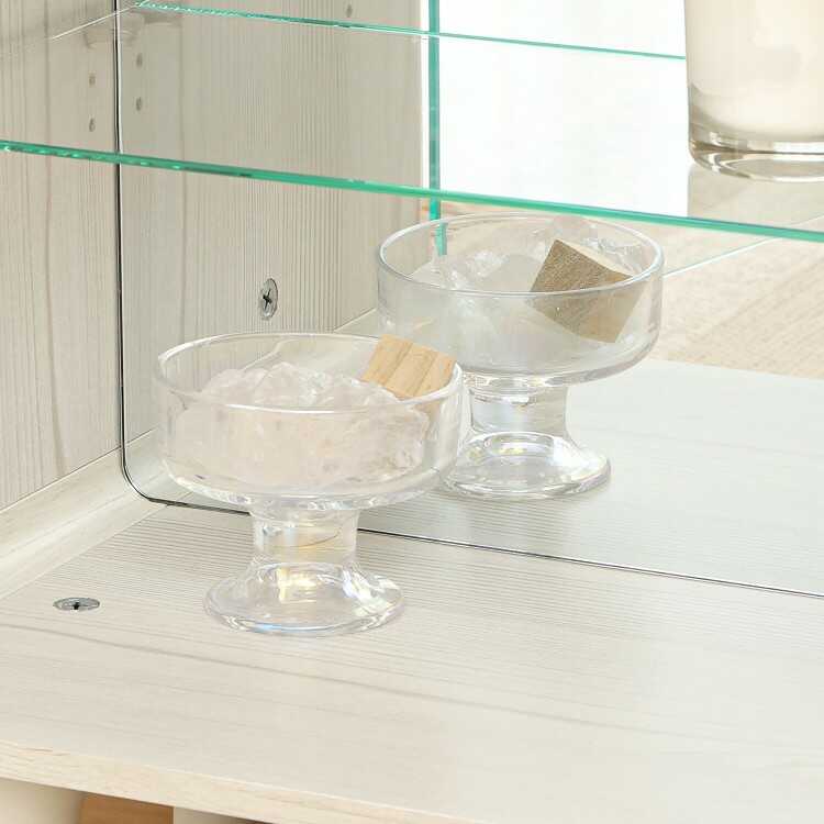 サイズ 幅79.5cm、奥行25cm、高さ46cm、重量13.5kg 材質 プリント紙化粧繊維板、3mm強化ガラス、ミラーガラス、天然木ラバーウッド 構造仕様 お客様で組み立てていただく商品です