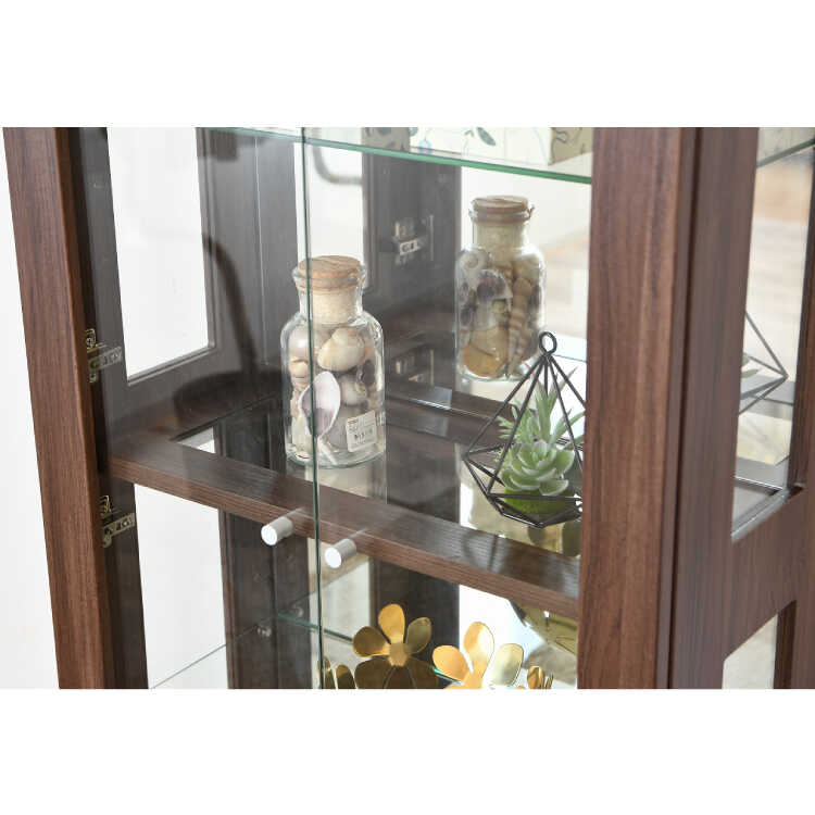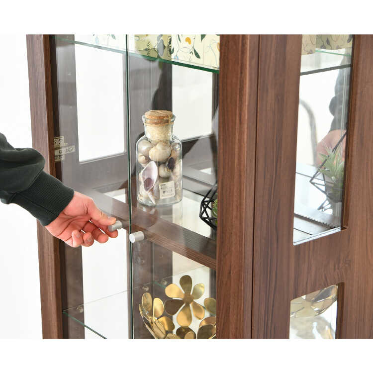 木目ブラウンの本体にガラス棚を並べたコレクションキャビネット。