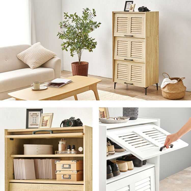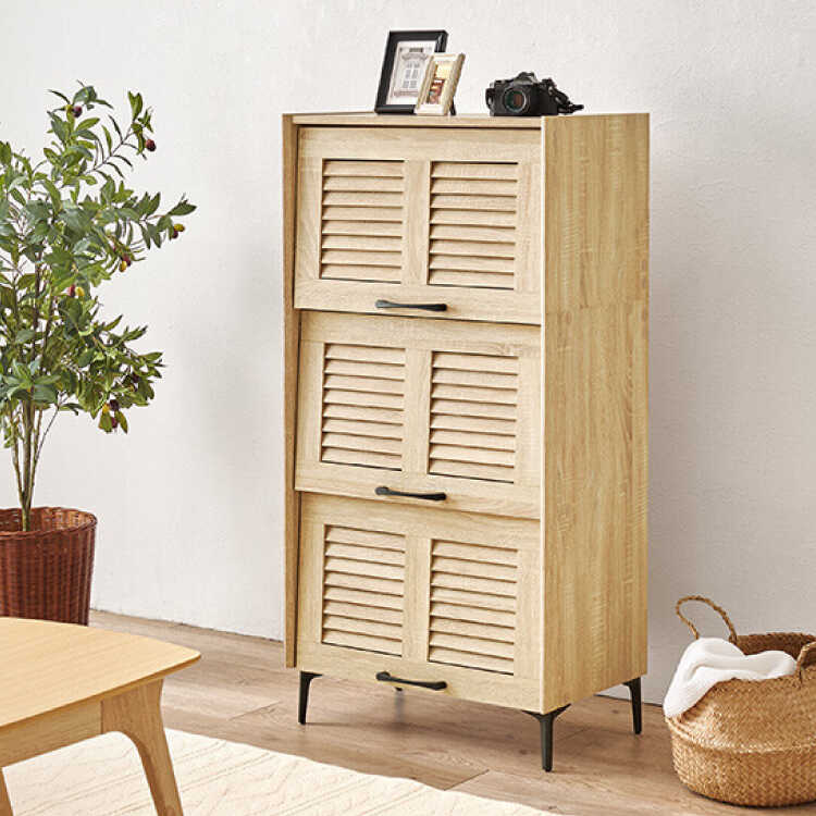 幅61cm・通気性の良いフラップ扉の収納キャビネット(3段タイプ・ナチュラル色)