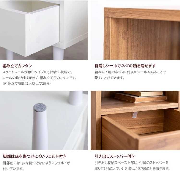 仕様補足 耐荷重:(天板・オープン収納)約20kg、(引き出し収納)約5kg 注意事項 ※販売カラーはホワイトです。ブラウンは別ページで販売しています。