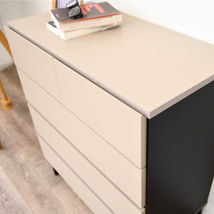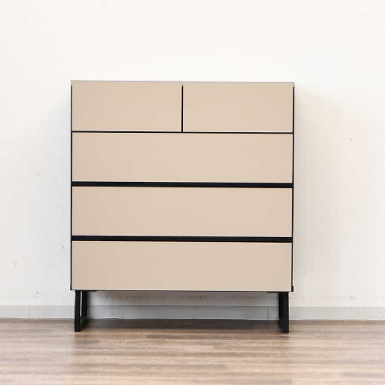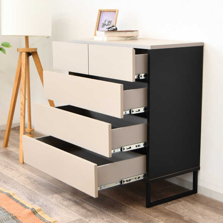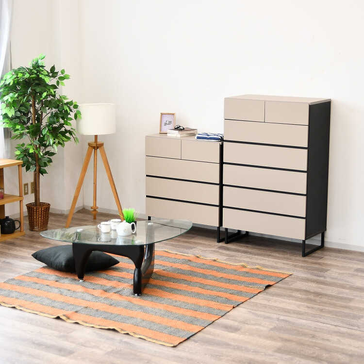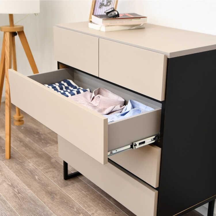 人気のグレージュ色と黒のアクセントカラーの組み合わせがスタイリッシュな4段チェスト。