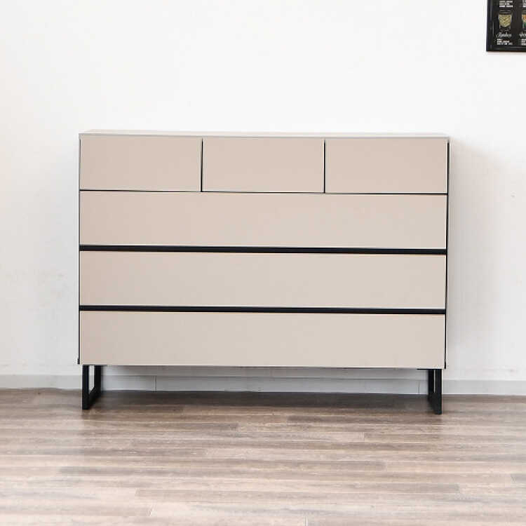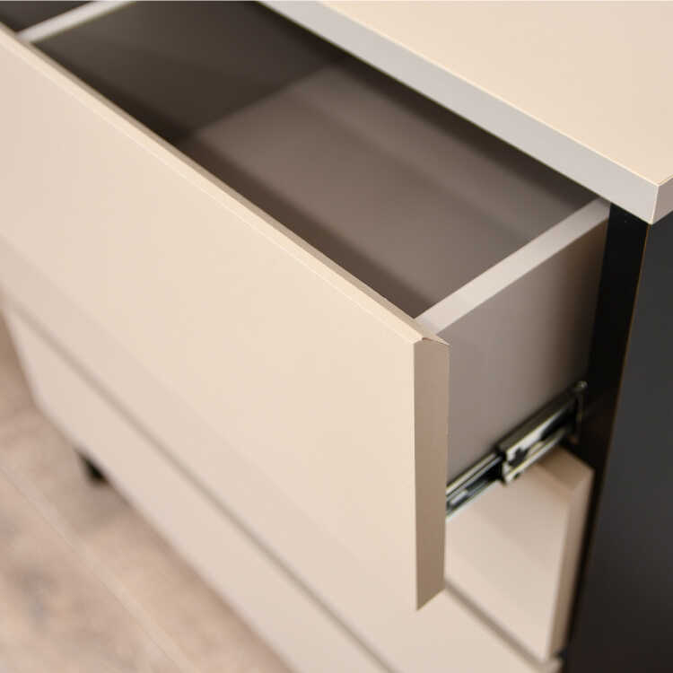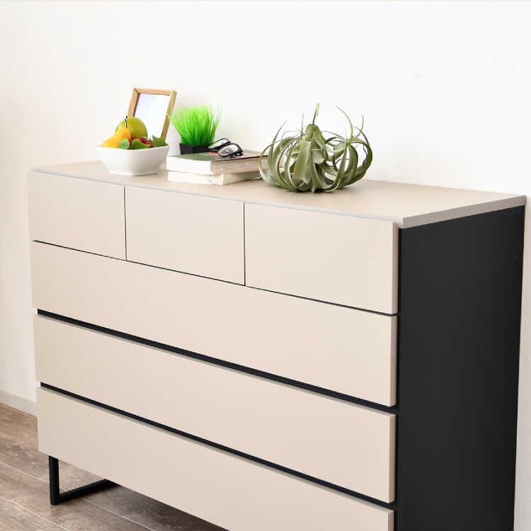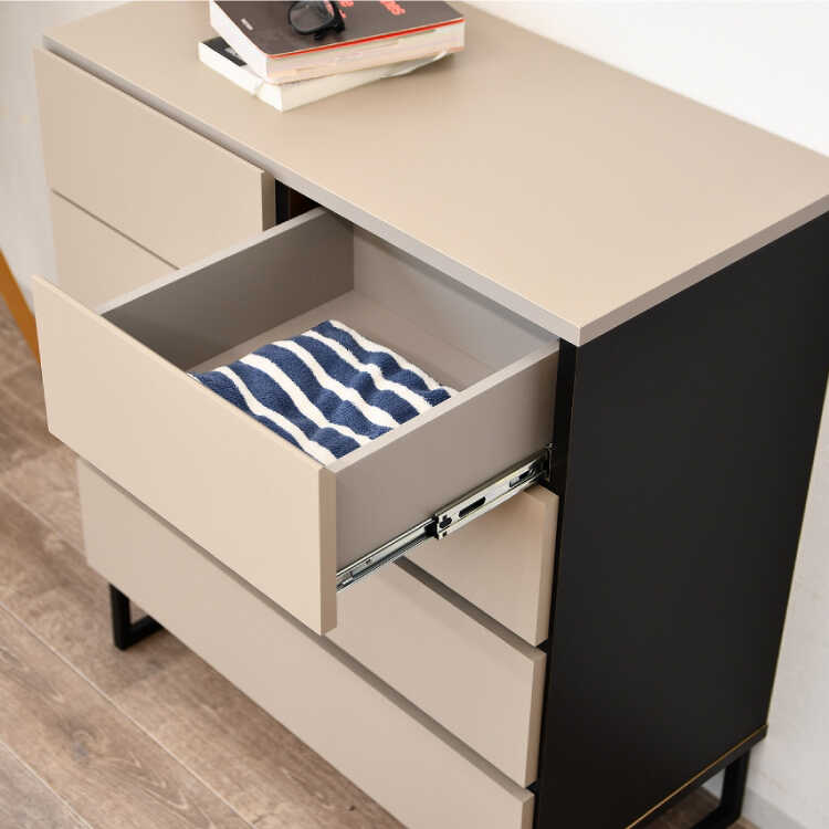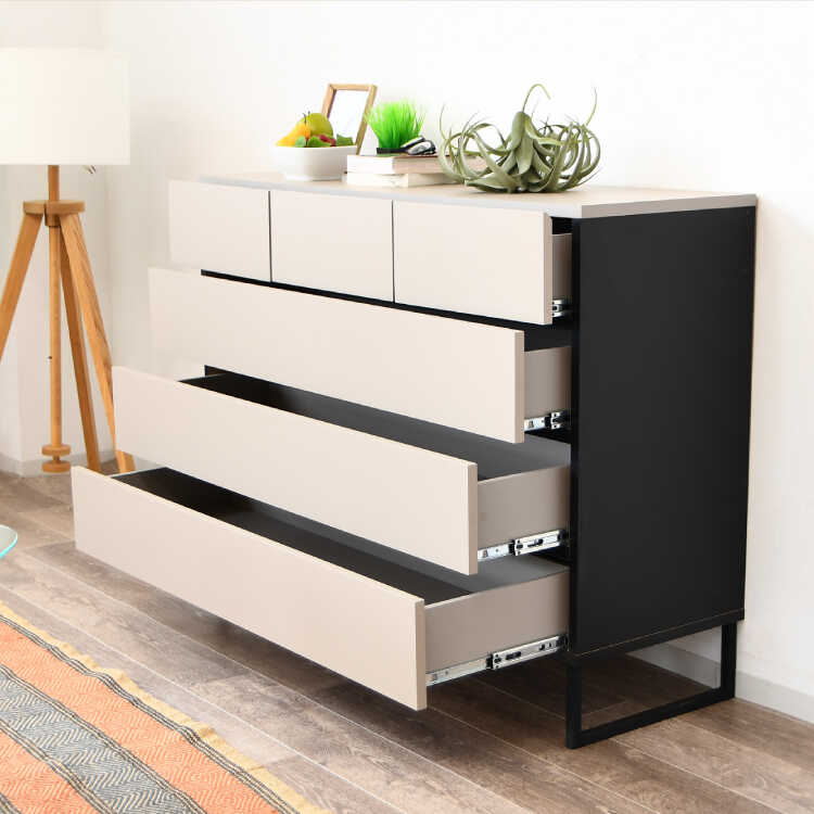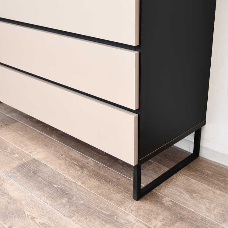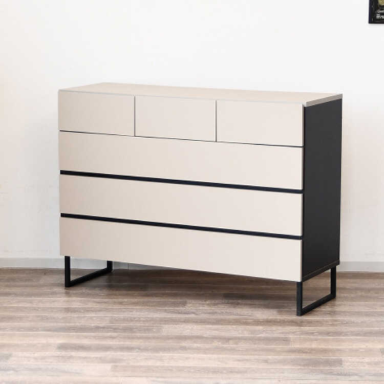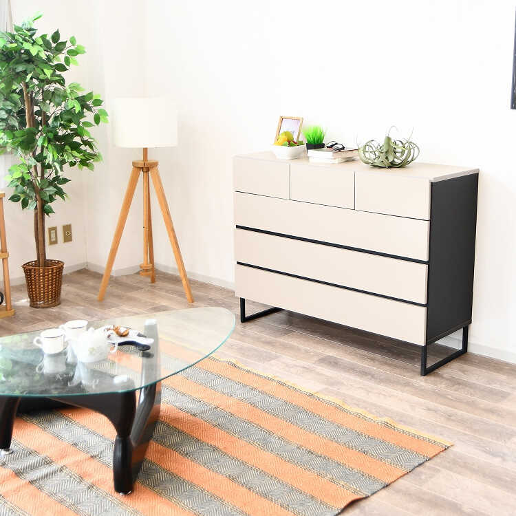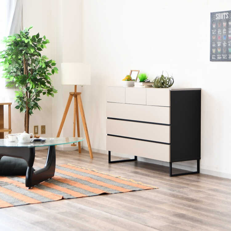 人気のグレージュ色と黒のアクセントカラーの組み合わせがスタイリッシュな4段のワイドチェスト。