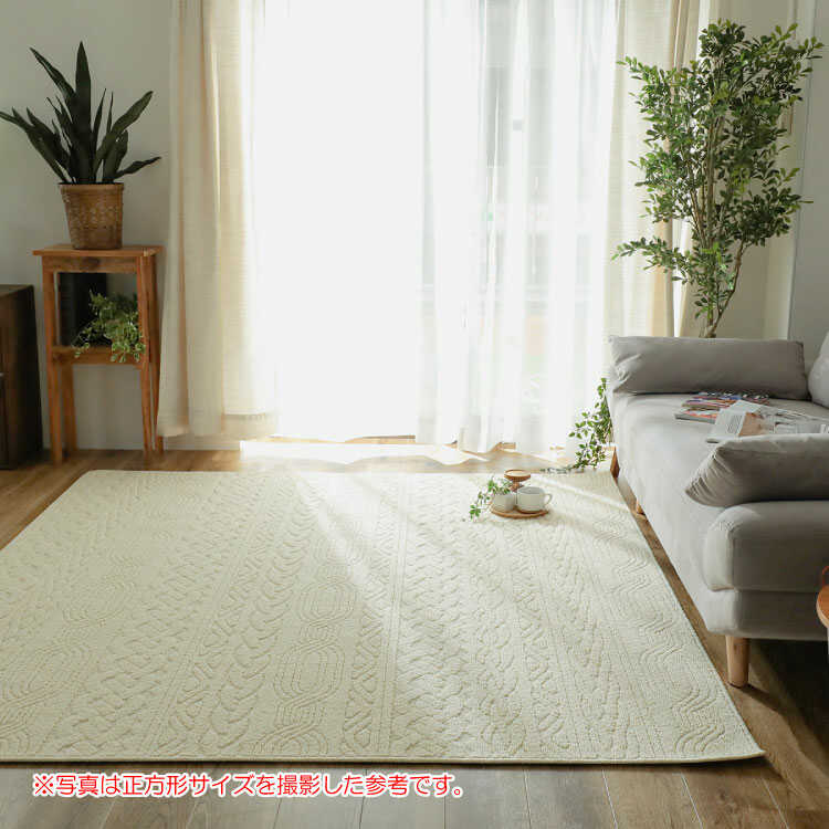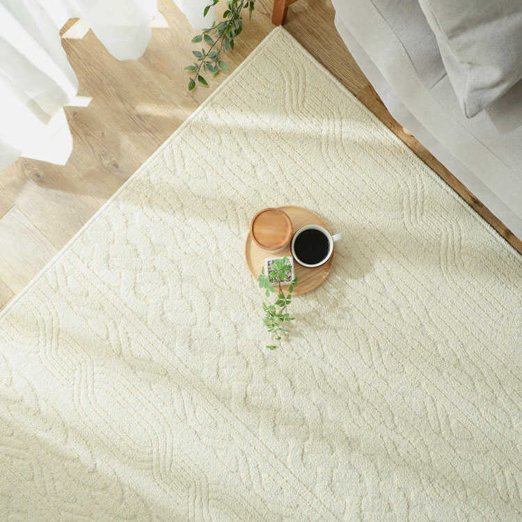 抗ウィルス加工等の優れた機能性を取り揃えた国産ラグマットは、表面にアラン編み模様を使用したおしゃれな仕上がり。