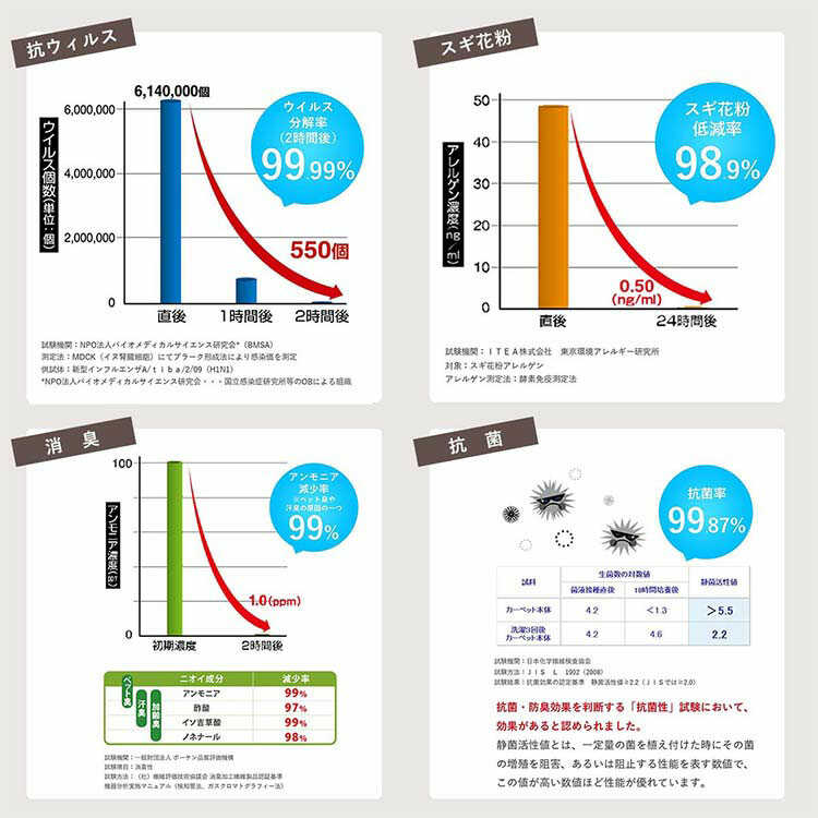 検証実験によると2時間で99.9%のウィルスを分解し、スギ花粉の低減率は24時間で98.9%と優れた成果を残しています。
