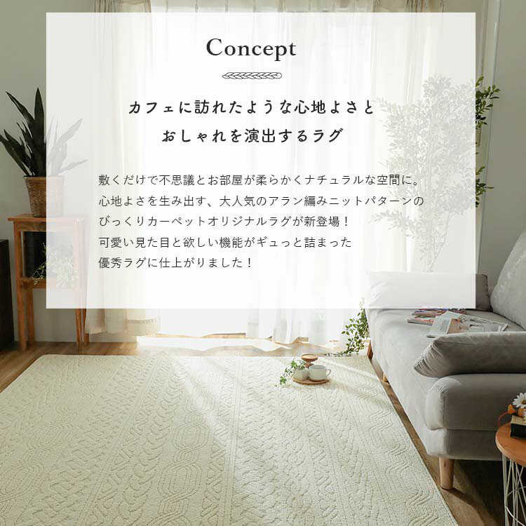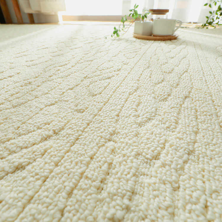 人やペットの健康面にも配慮した防臭効果の高い国産ラグマットは、アラン編み模様が施されたお洒落なデザイン。