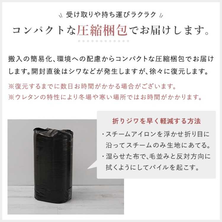 圧縮梱包注意事項 ※開梱時に匂いがする場合があります。徐々に薄まっていきますが、気になる際は風通しの良い所で陰干しをして下さい。