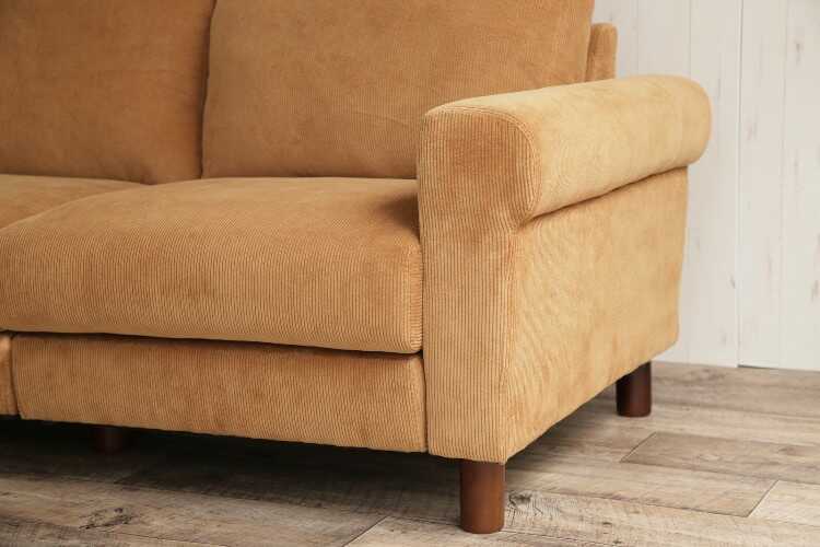 コーデュロイソファーの肘置きは、外側に向かって曲線を描いたアール型デザインで細部までこだわりを感じさせます。