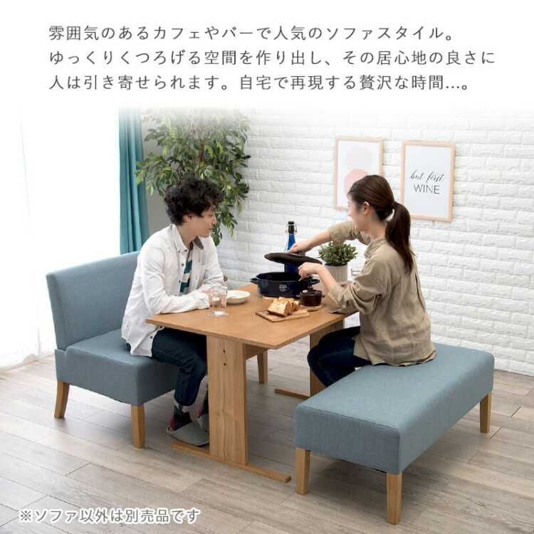 ダイニングにおすすめの布製2人掛けソファーは肘置きをあえてなくすことで、テーブルに座っていても出入りが楽々。