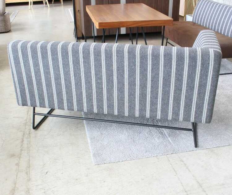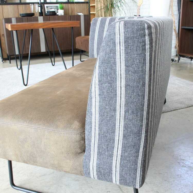 グレー色のストライプ柄背もたれにブラウンカラーの座面を合わせたお洒落なソファーはモダンでシックな大人の魅力が漂います。