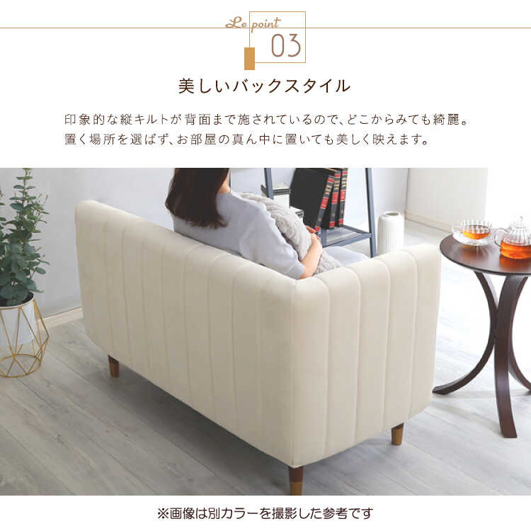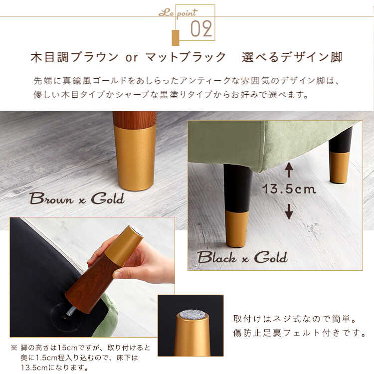 片肘タイプのコンパクトな2人掛けソファーは、温かみのある木目調ブラウンとシックなマットブラックの2色から脚をお選びいただけます。脚裏には床面への傷を防止するフェルト付きです。背面まで美しい作りなのでお部屋の真ん中にも置けて、レイアウトしやすいです。別カラーもご紹介していますので、是非合わせてご覧ください。(※本ページはベージュ色の販売です。)