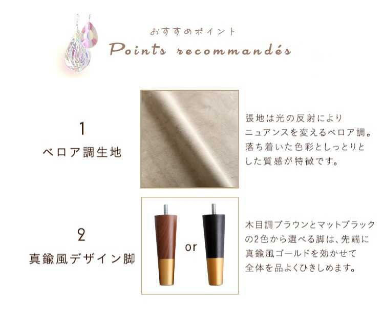張り地はなめらかな肌触りが特徴のベロアを使用しました。布地なので通気性があり、冬はヒンヤリせず、夏はサラッと年中快適な使い心地です。光の当たり方によって色味が変わるオシャレな生地で、お部屋に置くだけで落ち着いた高級感のある雰囲気を演出します。派手すぎないくすみカラーを使用した大人なデザインに癒されます。