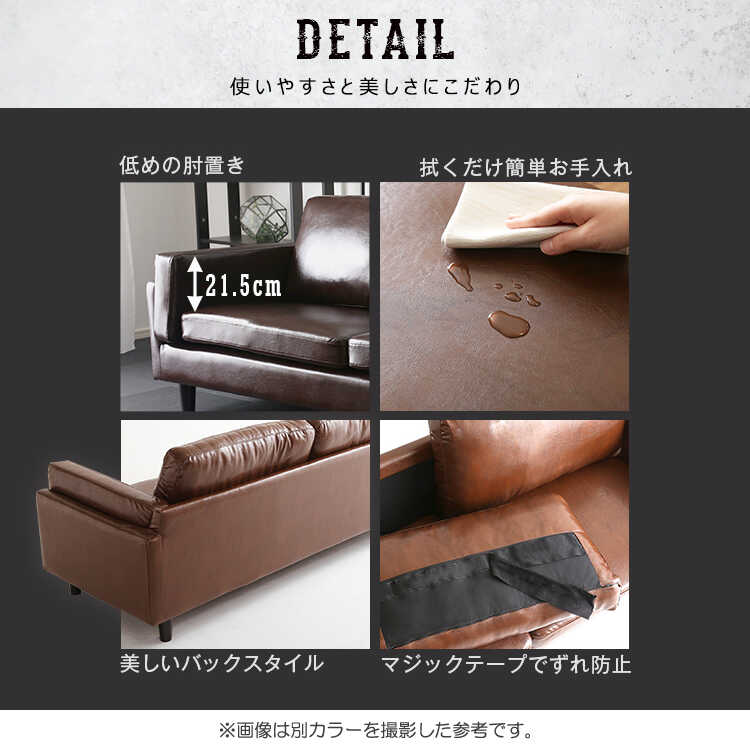 ヴィンテージ風で激安な3人用ソファーは、脚を外してロータイプソファーとしても使用できます。お部屋の圧迫感を軽減できるので、狭いスペースにもおすすめです。また、背面から見ても美しいデザインなので、空間を仕切るようなレイアウトも楽しめます。別カラーもシリーズ展開していますので、是非お好みに合わせてお選び下さい。(※本ページはダークブラウンの販売です。)