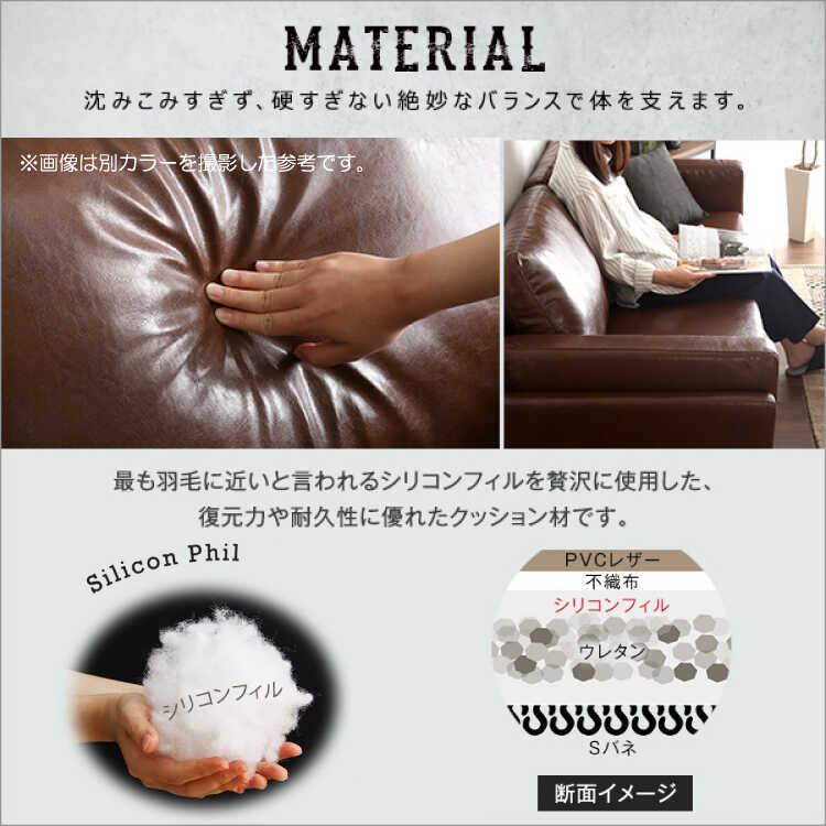 座面内部はSバネ・ウレタン・シリコンフィルを使用した贅沢な仕上がりです。シリコンフィルは復元性と耐久性に優れており、羽毛に近い柔らかなクッション性が特徴です。座面は程よい弾力でしっかりと体を支えてくれるので、上質な座り心地を体感していただけます。背もたれはゆったり背中をあずけやすいよう、マジックテープでずれ防止が可能です。