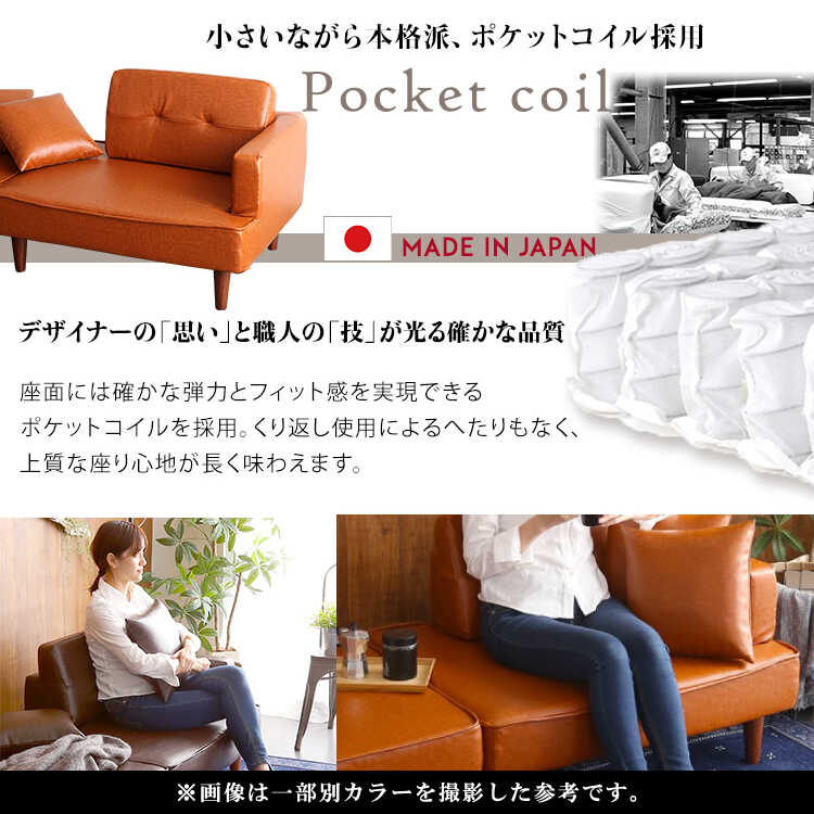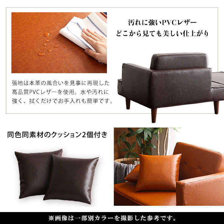 かっこいいヴィンテージ風の日本製カウチソファー。張り地は高級感のあるPVCレザーを使用しました。本革な風合いを表現した高品質な仕上がりです。水や汚れに強く、サッと拭くだけでお手入れ簡単なのも魅力的。同色のクッションが2個付属し、枕代わりや腰当てに使えて便利です。コンパクトながら本格派なつくりの日本製ソファーです。