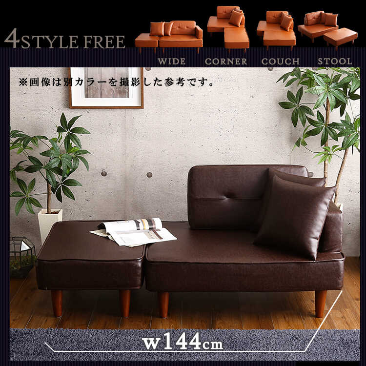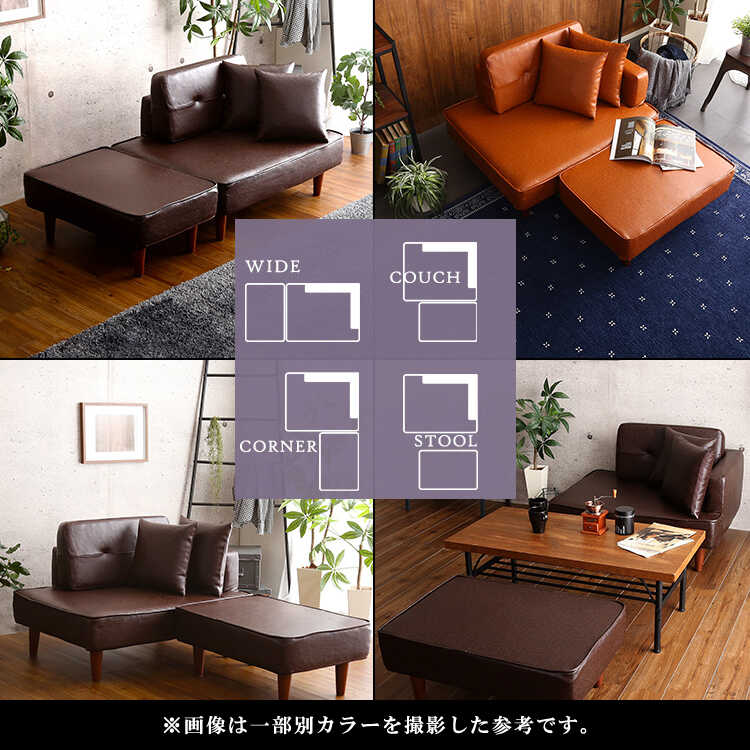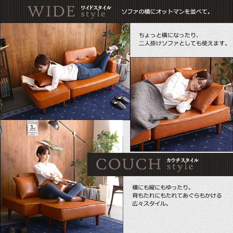 お部屋の間取りや気分に合わせて4パターンのレイアウトを楽しめるので、飽きにくく長くご愛用いただけます。ソファーの横にオットマンを並べたワイドスタイルは、2人掛けとしても使用でき、ゴロンと横になれるスペースがあります。オットマンに足を乗せるカウチスタイルは、胡坐をかくなど自由なくつろぎ方でリラックスできます。コーナースタイルはお部屋の角を有効活用したいときにおすすめ。オットマンを離して配置すれば来客用のスツールとしても使用できます。