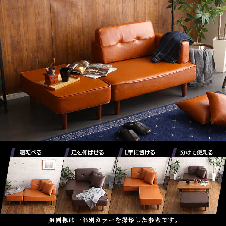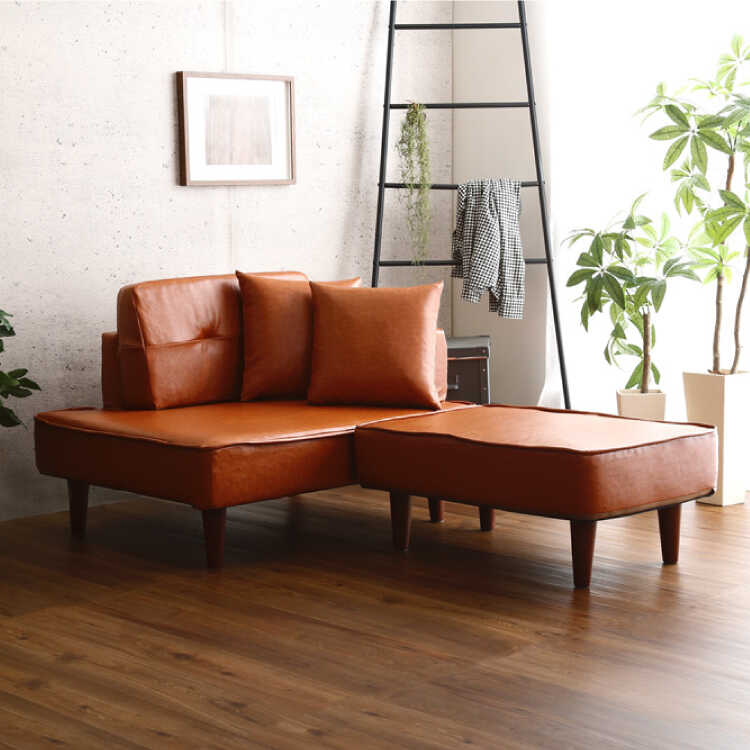 幅94~144cm・ヴィンテージな日本製カウチソファー(オットマン付き・ブラウン)