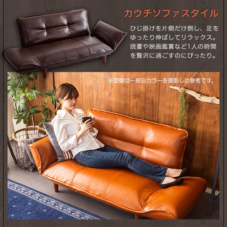 14段階のギア調整ができる背もたれ&バタフライ肘の日本製カウチソファー。ひじ掛けを片側だけ倒し、足を伸ばしてくつろげるカウチスタイルや、背もたれとひじ掛けをフラットに倒して横になれるベッドスタイルなどが可能です。張り地は高級感のあるPVCレザーを使用しました。本革の風合いを表現した高品質な仕上がりです。水や汚れをサッと拭きとれてお手入れ簡単です。