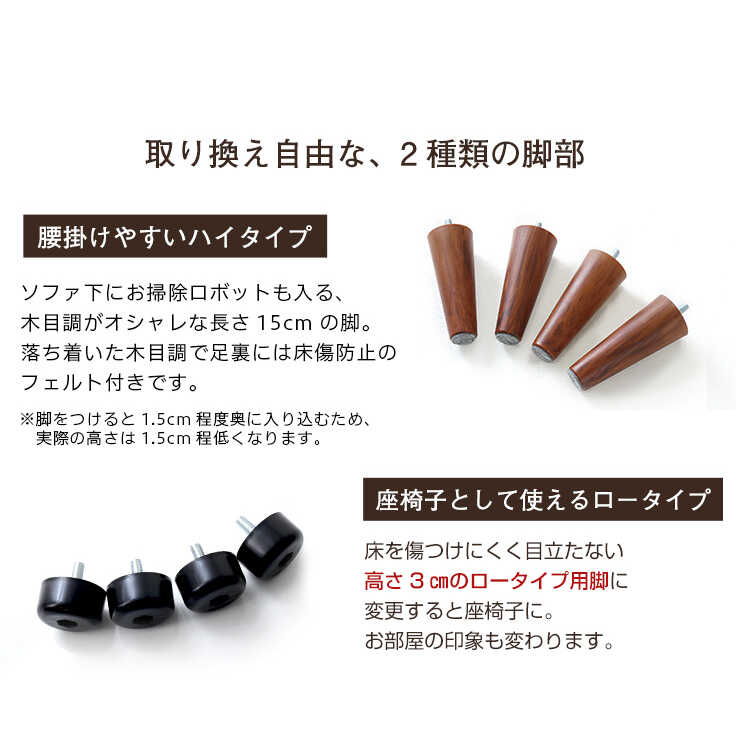座面内部はマットレスにも使用されるポケットコイル構造を採用しました。コイルひとつひとつが体重を捉えることで、身体への負担を軽減します。長時間座っても疲れにくく、快適な姿勢をキープできます。脚はハイタイプ用とロータイプ用の2種類ご用意しました。ロータイプの脚は圧迫感を軽減できるので、狭い場所にソファーを設置したい方におすすめです。