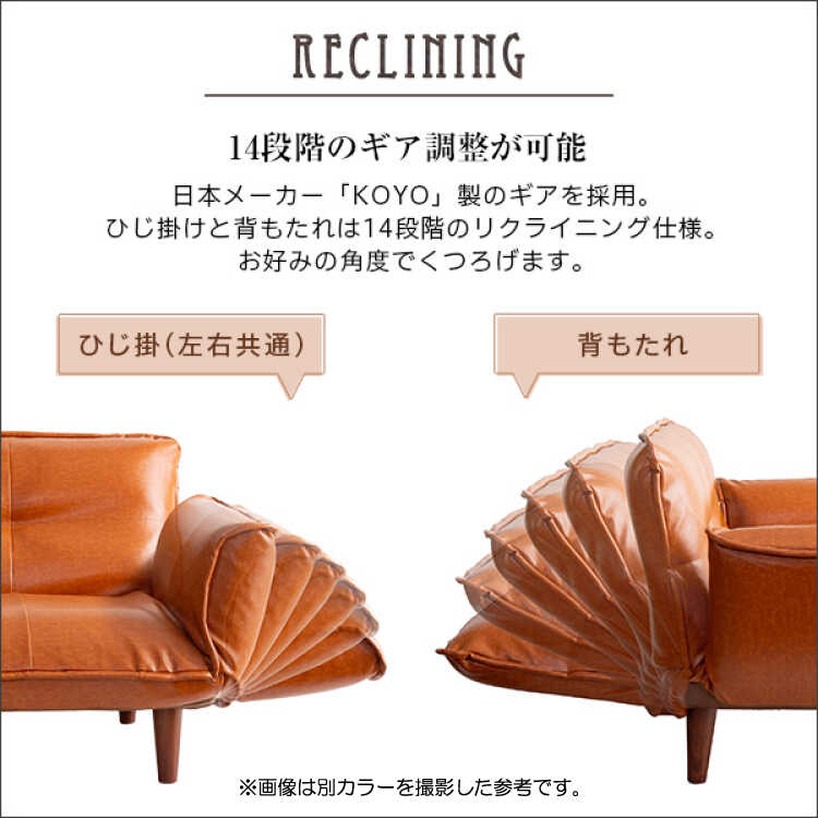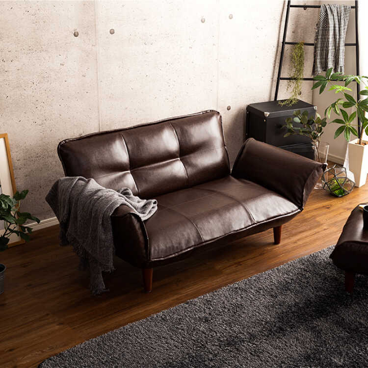 14段階のリクライニングができる背もたれ&バタフライ肘の国産カウチソファー。ひじ掛けを片側だけ倒し、横向きで足を伸ばせるカウチスタイルや、仮眠に最適なベッドスタイルなどが可能です。張り地はかっこいいPVCレザーを使用しました。本革風にデザインされた高級感のある仕上がりです。水や汚れに強く、サッと拭きとれてお手入れラクラク。