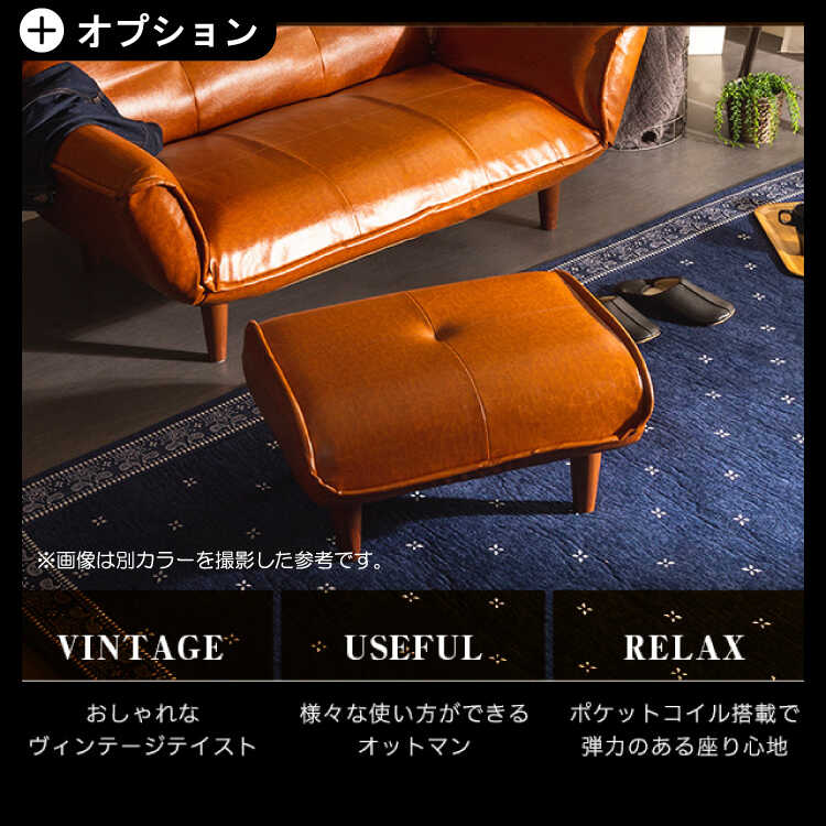 オットマン(オプション):幅59cm、奥行49cm、高さ29.5cm、重量4kg材質 構造部材:スチールパイプ、ポケットコイルスプリング、樹脂脚