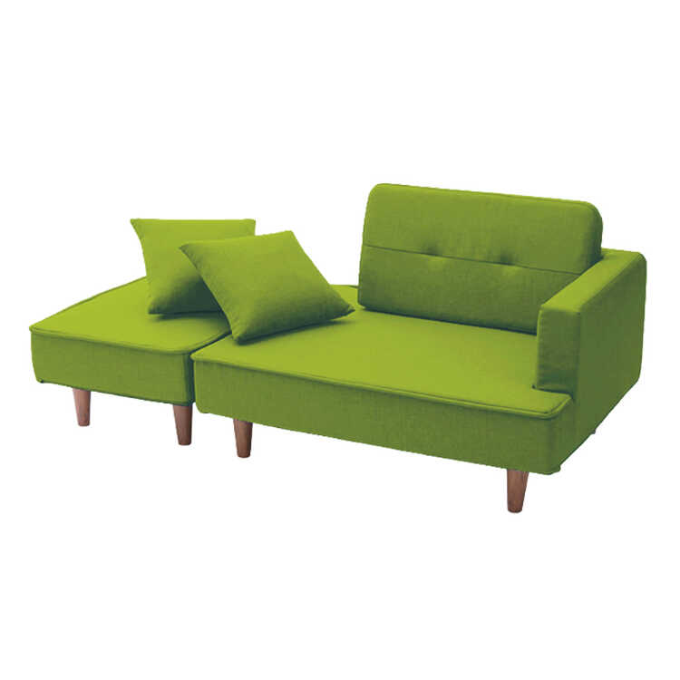 品質にこだわった日本製のお洒落な布製カウチソファー。張り地は通気性の良い布地を使用しました。冬はヒンヤリせず、夏はべたつかずにサラッとしており、年中快適な使い心地です。カラーは優しいグリーン色を使用しました。パッと明るい印象でお部屋に彩りをプラスします。脚は木目調にデザインされたぬくもりのある仕上がりです。