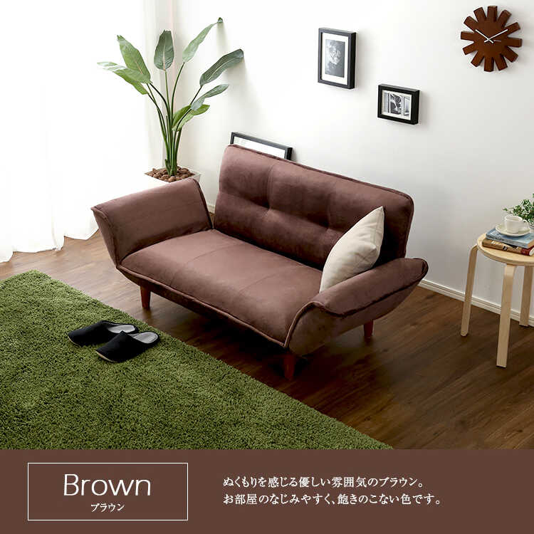 幅130~170cm・起毛生地のリクライニングカウチソファー(国産・ポケットコイル採用・ブラウン色)