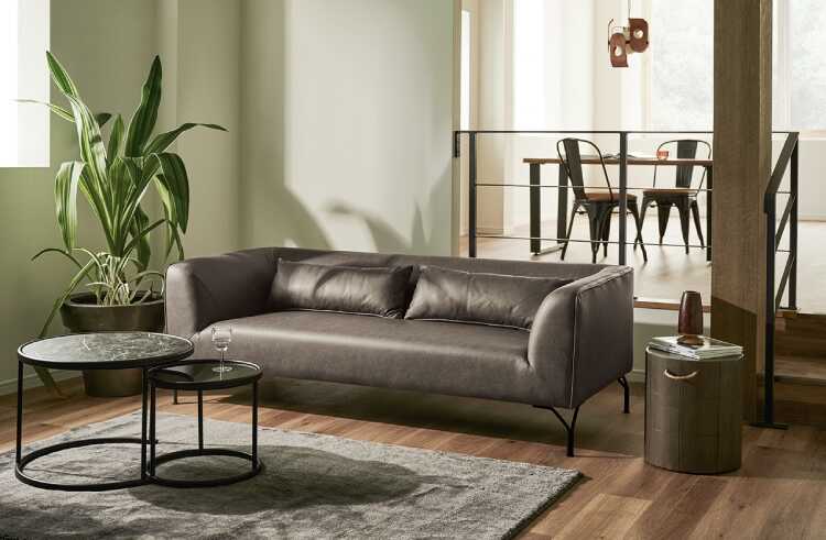 汚れに強いハイデザインの高級三人がけソファー。サイズは幅189cmと大きめなので大人2~3人でゆったり座ることができます。張り地にはレザーに見える布ファブリック製。本物の革を使用していないのでお手入れがしやすく、日常使いに最適です。カラーはヴィンテージやモダン、クールなお部屋のテイストにマッチするスモークグレー。ブラックのスチール脚がかっこよく、洗練された空間を演出します。