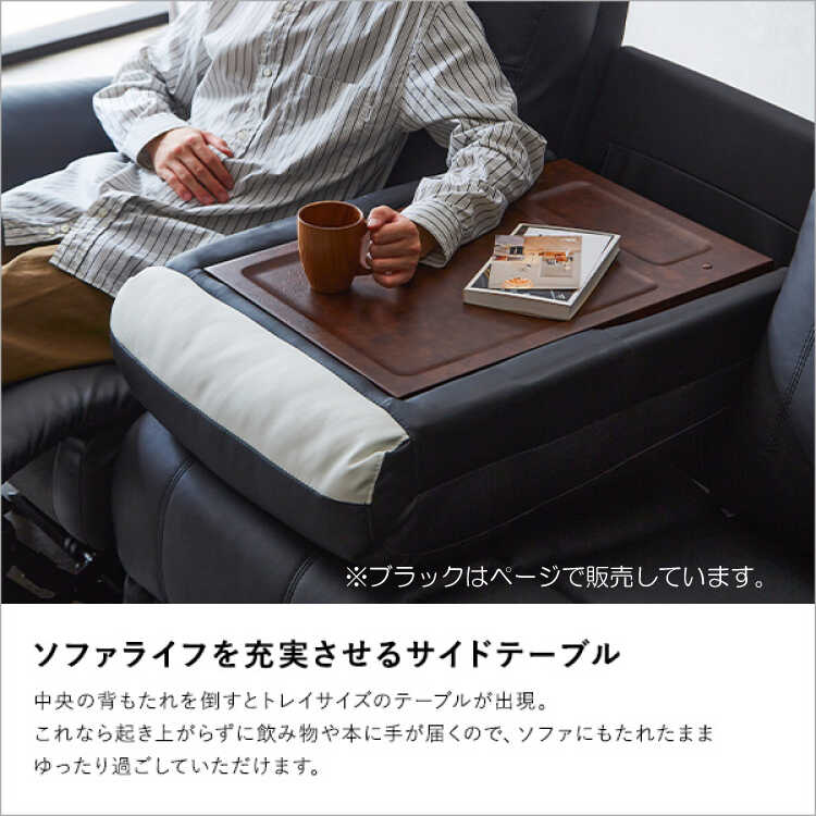 中央の背もたれを倒すとトレイサイズのテーブルが出現。読みかけの雑誌や本、リモコンを置いたり、コップを置いたりできるのでサイドテーブルを置く必要がありません。