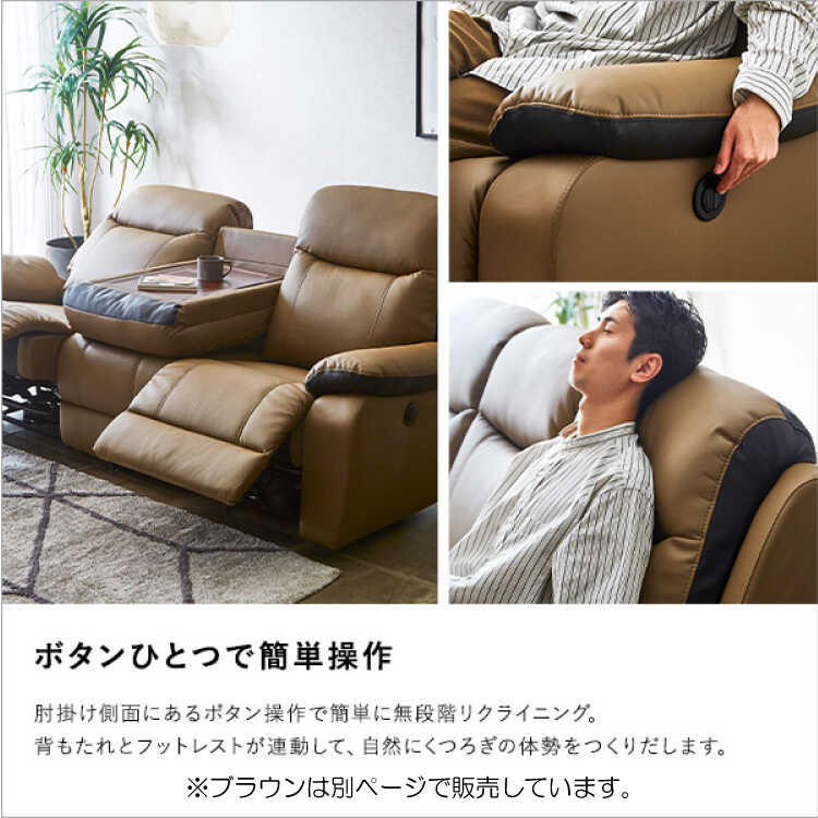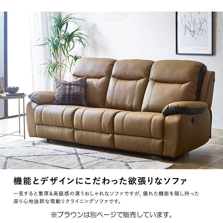 幅202cm・三人用電動ソファー(ソフトレザー・リクライニング無段階・黒ブラック)