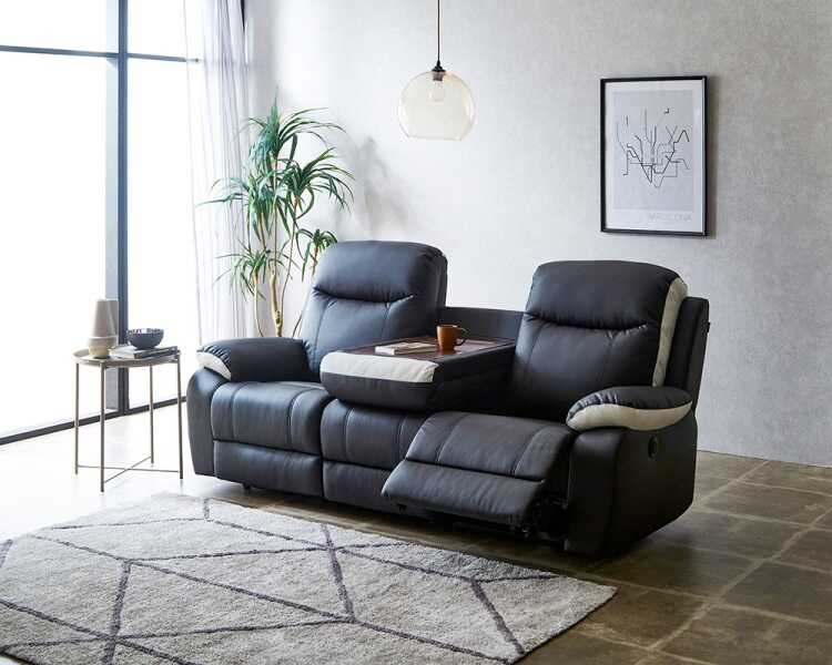 一度使うと手放せない、デザイン性&機能性を兼ね備えたソフトレザー製三人用電動ソファー。両側のソファの背もたれは無段階の角度調節ができるリクライニング機能付き。足が伸ばせるフットレストも連動して自然な体勢で寛ぐことができます。さらに中央のソファを倒すとミニテーブルになり、ソファにもたれながら晩酌をしたり、映画鑑賞を楽しむことができます。お昼寝にも使えるリクライニング機能付きで、極上のリラックスタイムをご提供します。
