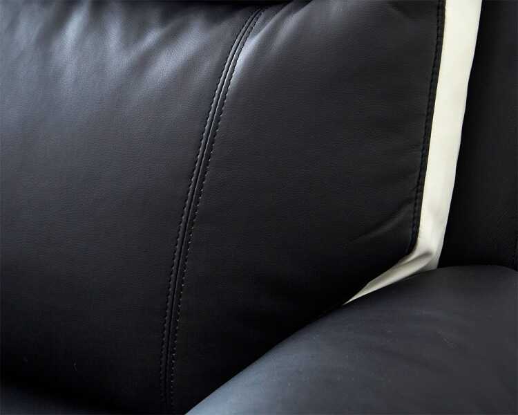 身体に直接触れる張地は滑らかな手触りが特徴のソフトレザーを採用。合成レザーを使用しているので汚れてしまってもサッと水拭きができお手入れも楽々。小さなお子様のいるご家庭でも安心してお使いいただけます。また、カラーはクールでかっこいい印象の黒ブラック。どんなお部屋にも溶け込みやすく、飽きが来にくいシンプルなデザインです。