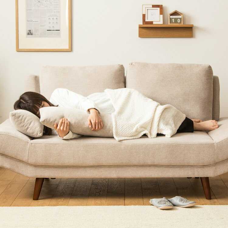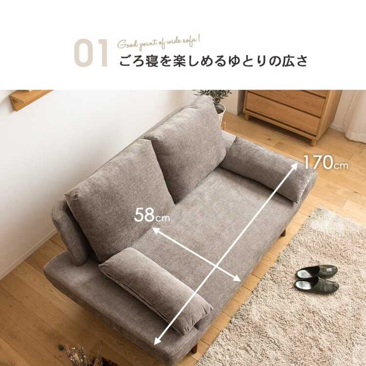 有効内寸が幅170cm、奥行58cmもある、寝転んでも余裕のワイドサイズのソファー。