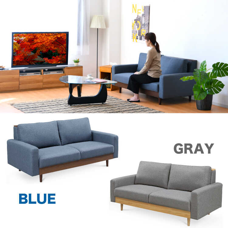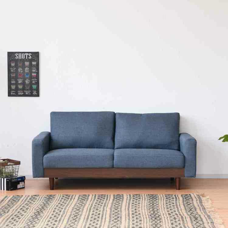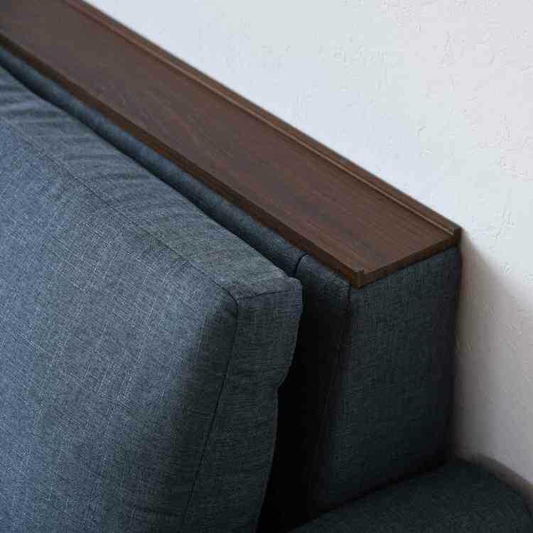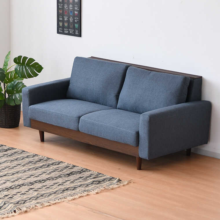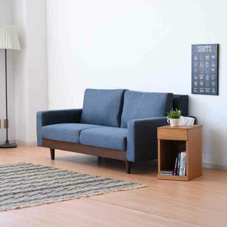 幅165cm・ウッド製の小物置き付きのツートンカラー2.5Pソファー(ブルー色・布張り)
