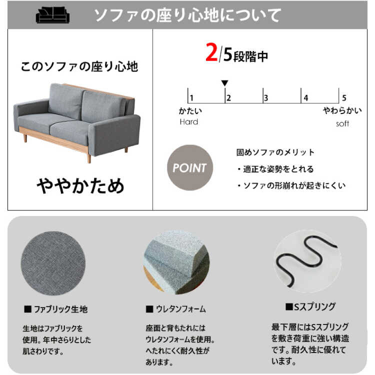 内部にはウレタンを惜しまず豊富に詰め込むことで、しっかりと弾力のある「やや硬め」の座り心地に設定されています。
