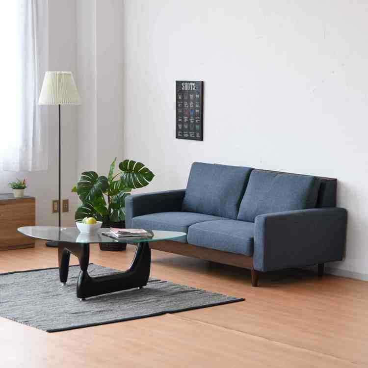 ウッド部分のブラウンカラーと布張り座面のブルー色のツートンカラーが上品でスタイリッシュなソファー。