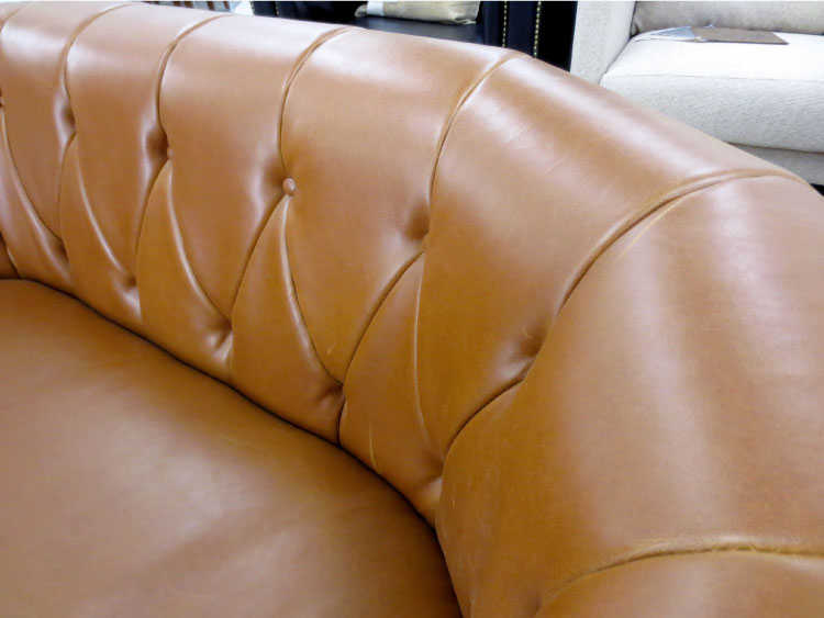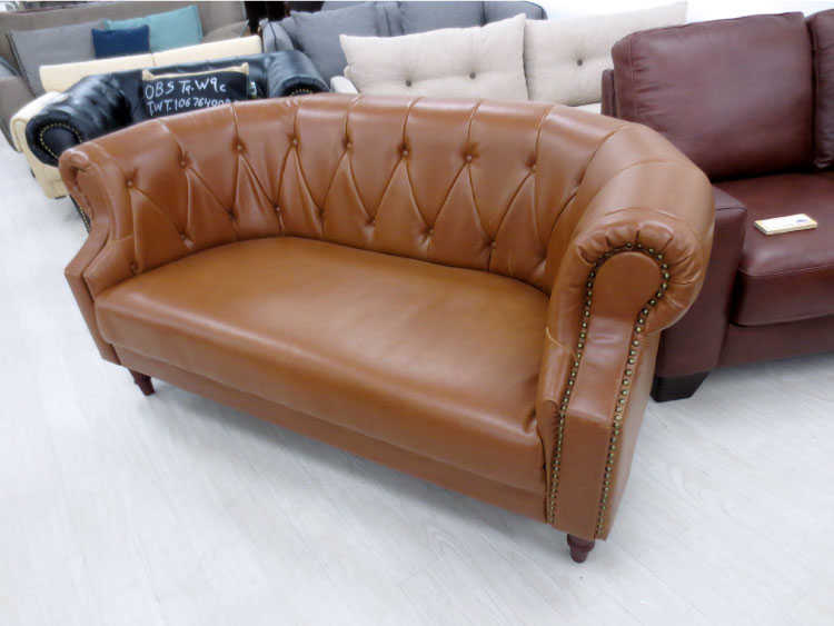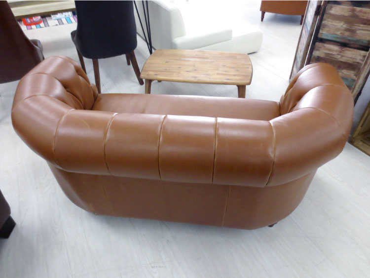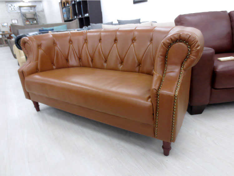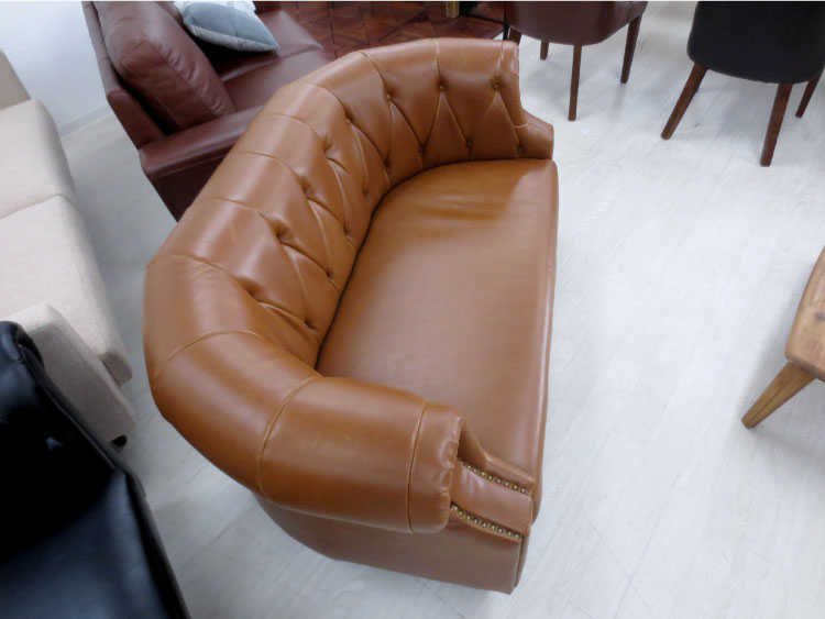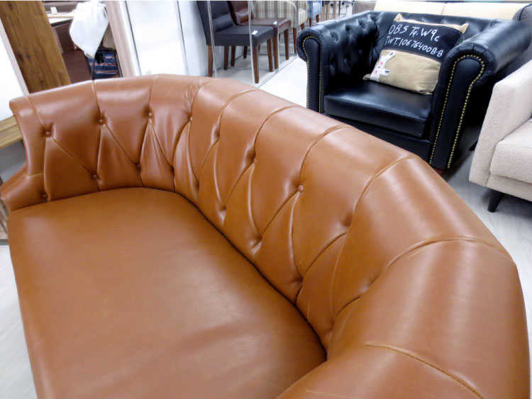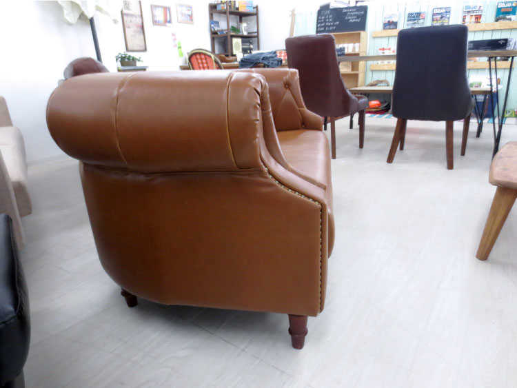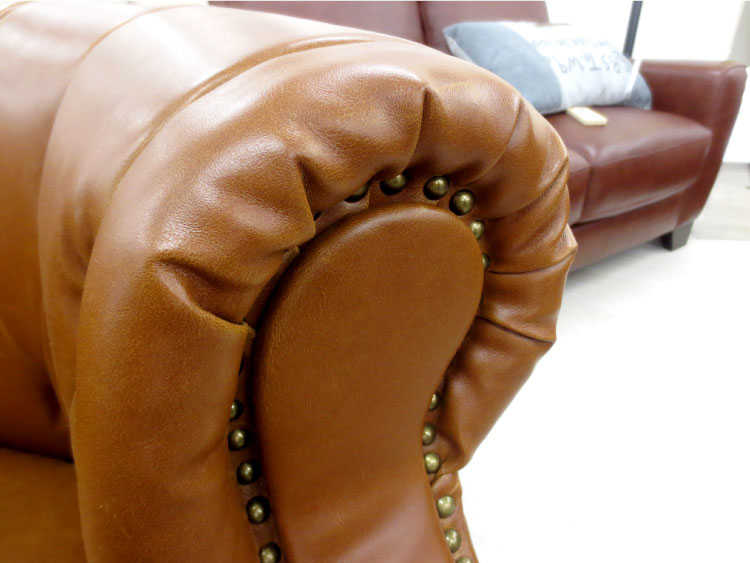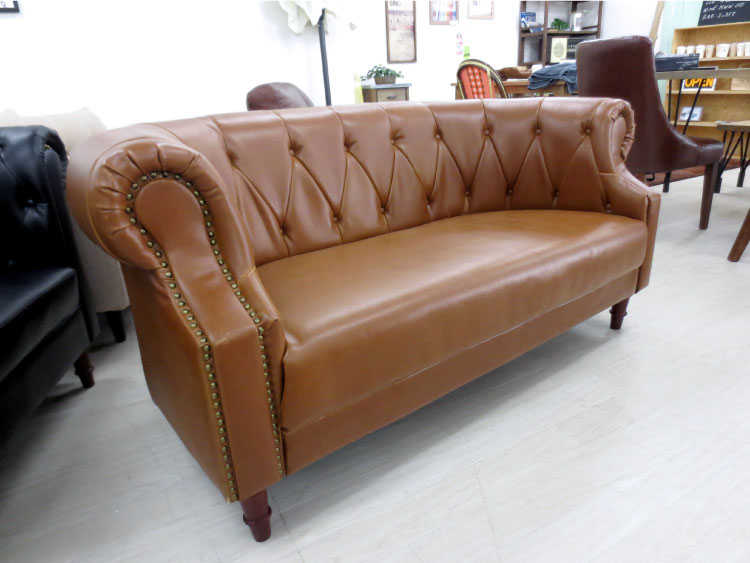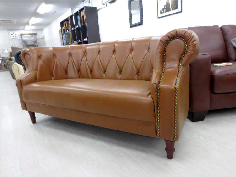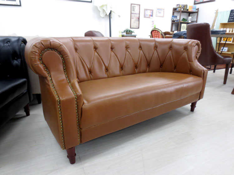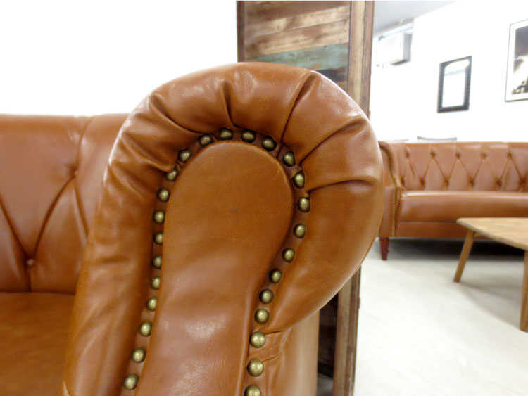 背もたれのボタンや肘置きには鋲が配され、ヴィンテージなインテリア家具がお好きな方にはたまらないアイテムです。
