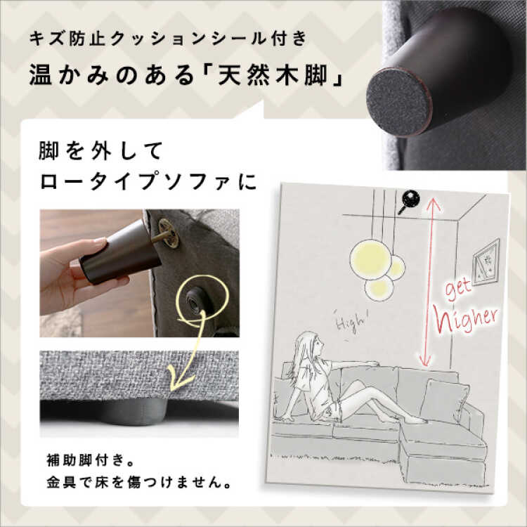 黒色のファブリック製L字ソファーは、脚を取り外して補助脚に付け替えることでローソファーとして使用できます。座面が低くなるので圧迫感が軽減でき、狭いお部屋にもおすすめです。また、本ページは黒いファブリック製ソファーの販売ですが、豊富なカラーを別ページで紹介していますので、是非お部屋にあわせてお選び下さい。