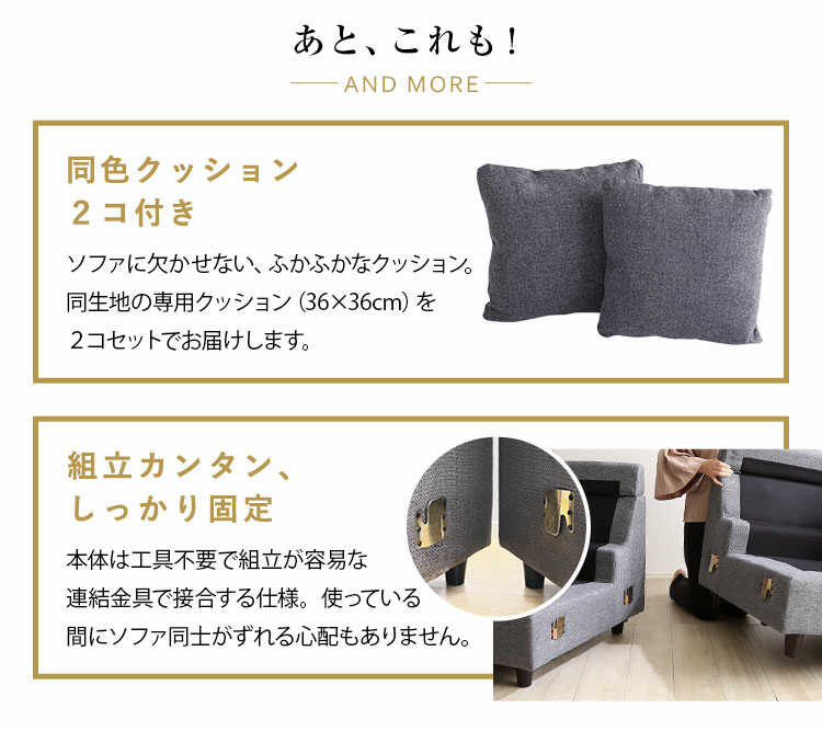 ソファと同色ミニクッション2個付属注意事項 ※本ページは黒色・ファブリックの販売です。他の色は別ページでご覧いただけます。