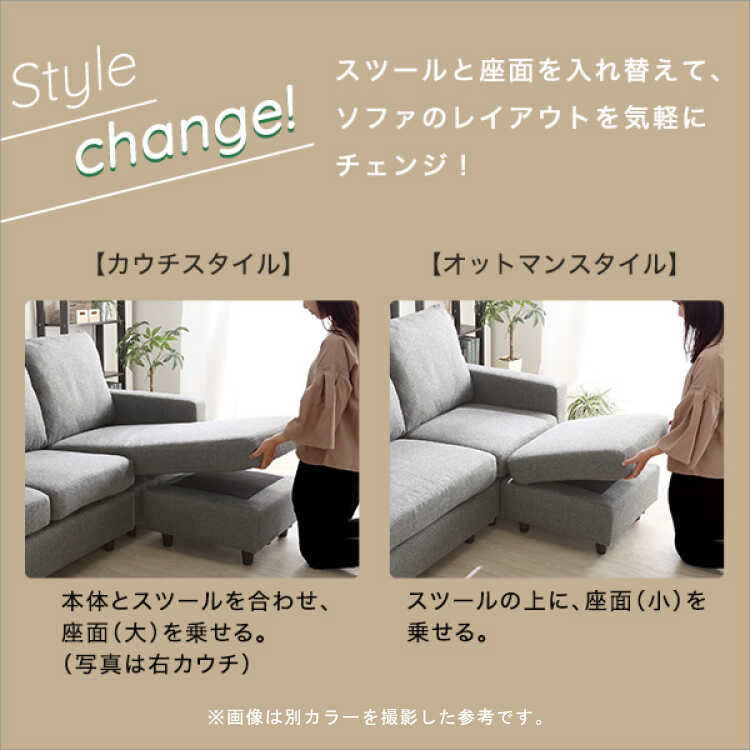 大きい座面と小さい座面を入れ替えることでカウチとオットマンの2スタイルにチェンジできます。カウチスタイルは足を真っ直ぐ伸ばしやすくリラックスできます。また、左右どちらでも配置できるので、間取りに合わせたレイアウトが可能です。オットマンスタイルは足を乗せるだけでなく、スツールやサイドテーブルとして離して使用できてとっても便利です。
