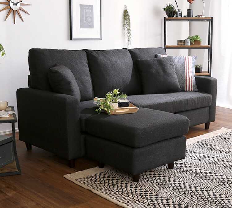 黒色のおしゃれなファブリック製L字ソファー