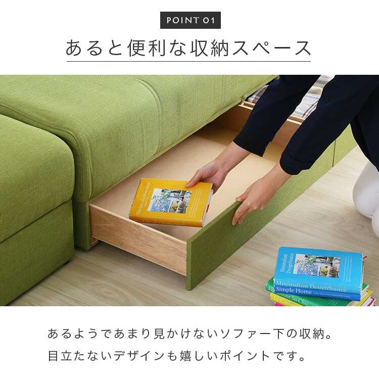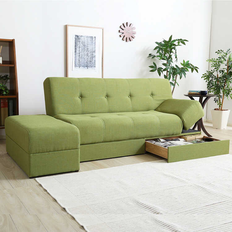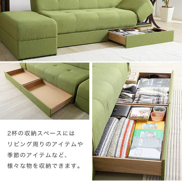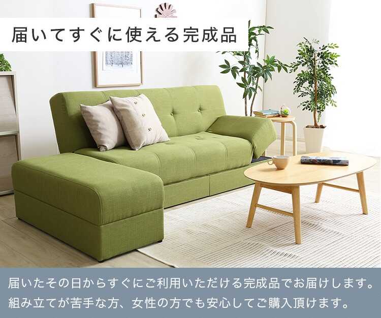 使い勝手抜群の日本製収納付きソファーベッドは、完成品でのお届けなので組立が苦手な方でも安心です。張り地は通気性の良いファブリックを使用しており、年中快適な使い心地です。カラーはナチュラルなグリーンを採用しました。別ページでブラウンもご紹介していますので、是非お部屋に合わせてお選び下さい。(※本ページはグリーン色の販売です。)