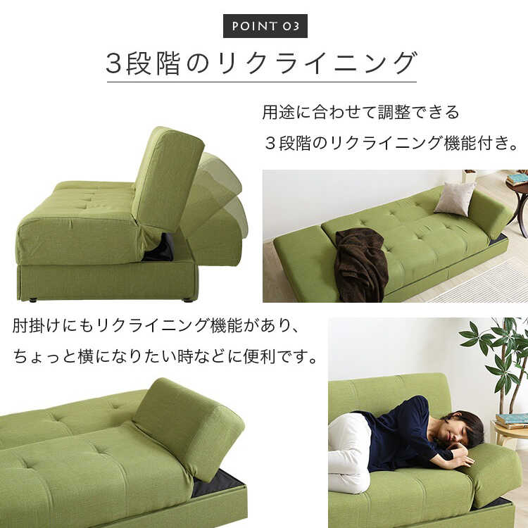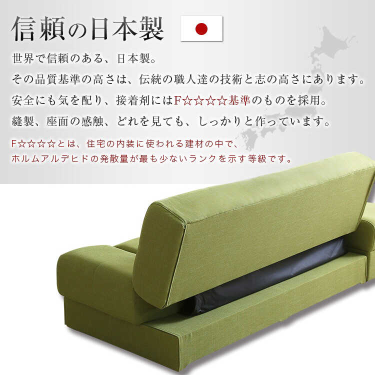 幅197cm・収納付きソファーベッド日本製(布ファブリック製・緑グリーン・リクライニング3段階)