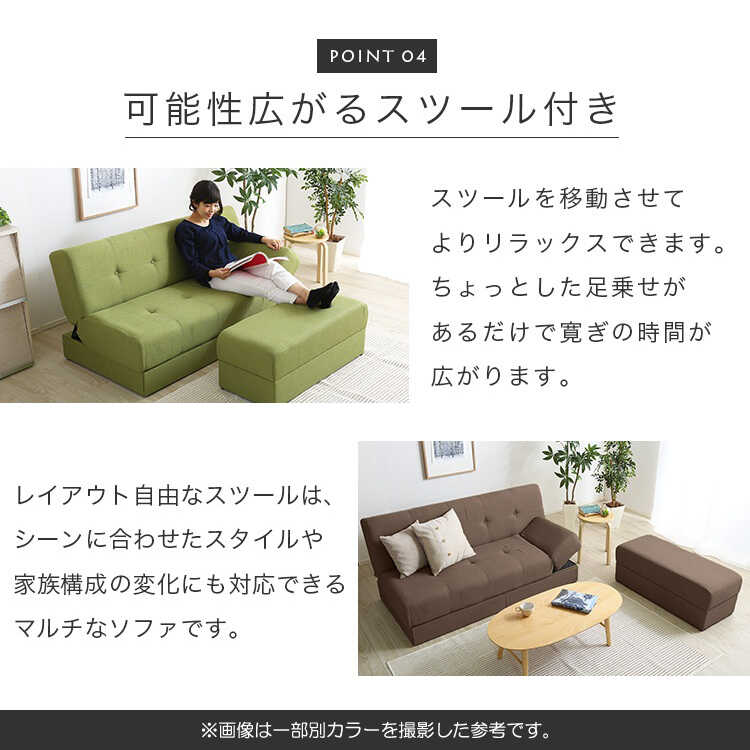 背もたれとひじ掛けに3段階のリクライニング機能が付いています。全てフラットにすればベッド代わりになり、ゆったりくつろげます。ひじ掛けのリクライニングはちょっと横になりたいときに枕代わりとして使用できて便利です。スツールも合わせると幅197cmととってもワイドになるので、大柄な方でも安心してお使いいただけます。