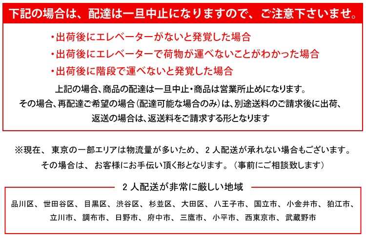 ・出荷後にエレベーターがないと発覚した場合、もしくはエレベータで荷物が運べないことがわかった場合、商品の配達は一旦中止・商品は営業所止めになります。再配達ご希望の場合は、別途送料の見積り後に出荷、返送の場合は、返送料はお客様負担となりますのでご注意下さい。