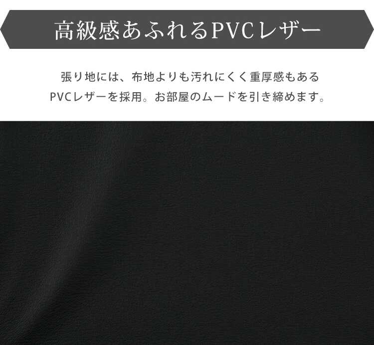かっこいいレザー製の張り地を使った日本製ソファーベッド。PVCレザーは水や汚れが付いても拭き掃除でお手入れできるので、メンテナンスしやすく人気です。カラーは高級感のあるブラックを採用しました。シックな色合いが印象的で、モダンやモノトーンなどの大人なインテリア空間におすすめです。コーナーには糸のほつれを防ぐパイピング加工が施されています。