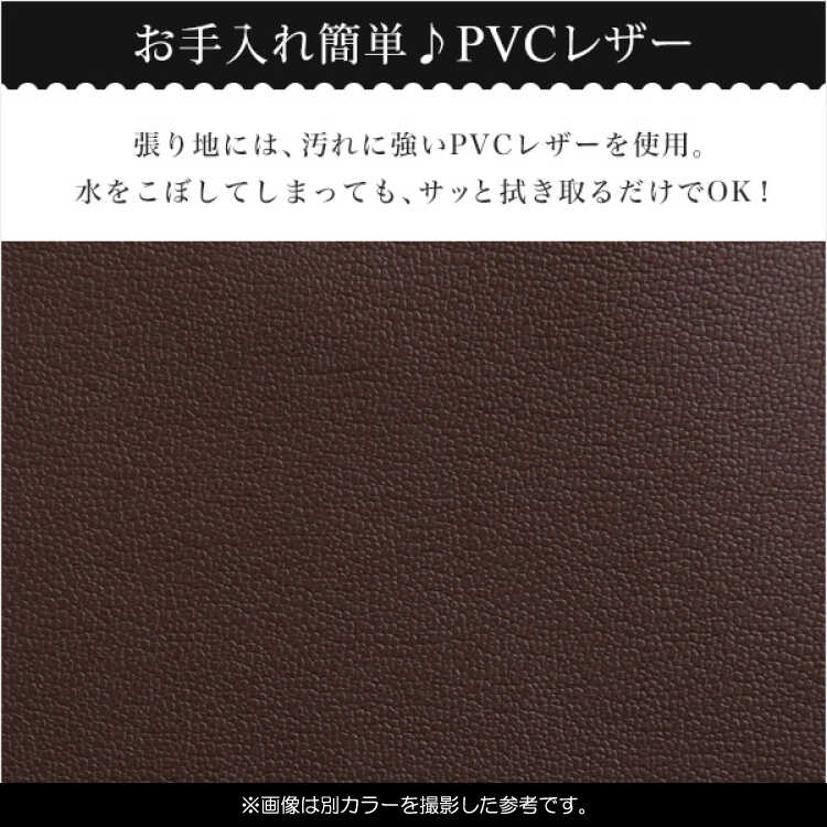 かっこいい黒色のレザー製ソファーベッド。張り地は水や汚れが付いてもサッとひと拭きでお手入れできるPVCレザーを使用しました。カラーはシックな黒色でまとめられ、大人っぽいインテリア空間にマッチします。脚は高級感のある天然木が使用され、裏面には床への傷防止用フェルトが付いた安全仕様です。ソファーと同色のクッションが2個付属し、枕代わりに便利です。