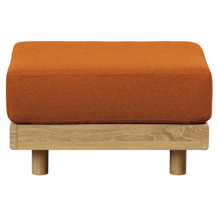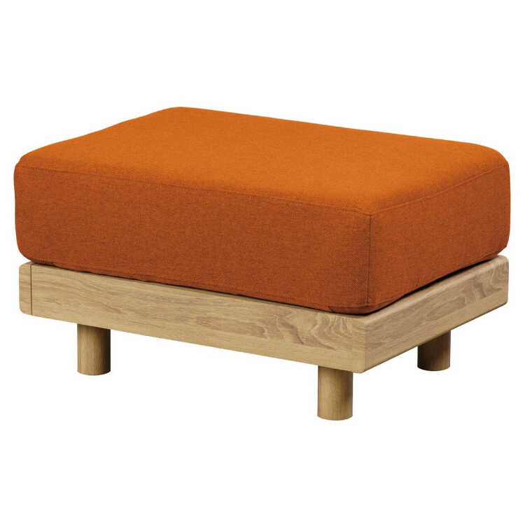 木目が綺麗なナチュラルカラーのフレームにオレンジ色のクッションを組み合わせたスツール・オットマン。