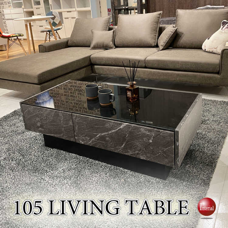 幅105cm・大型収納付き高級ガラス製リビングテーブル(完成品・大理石柄ブラック)