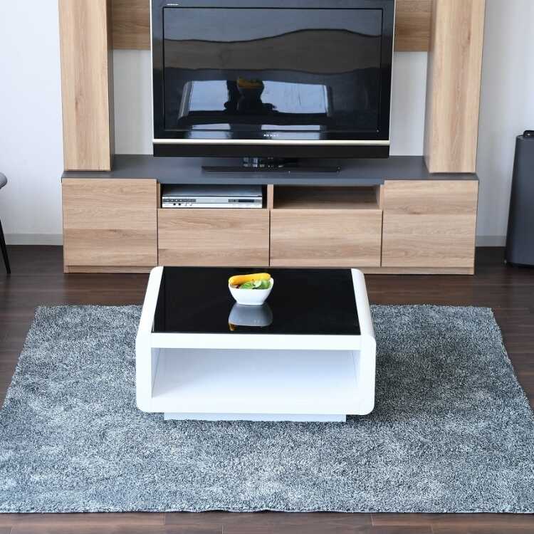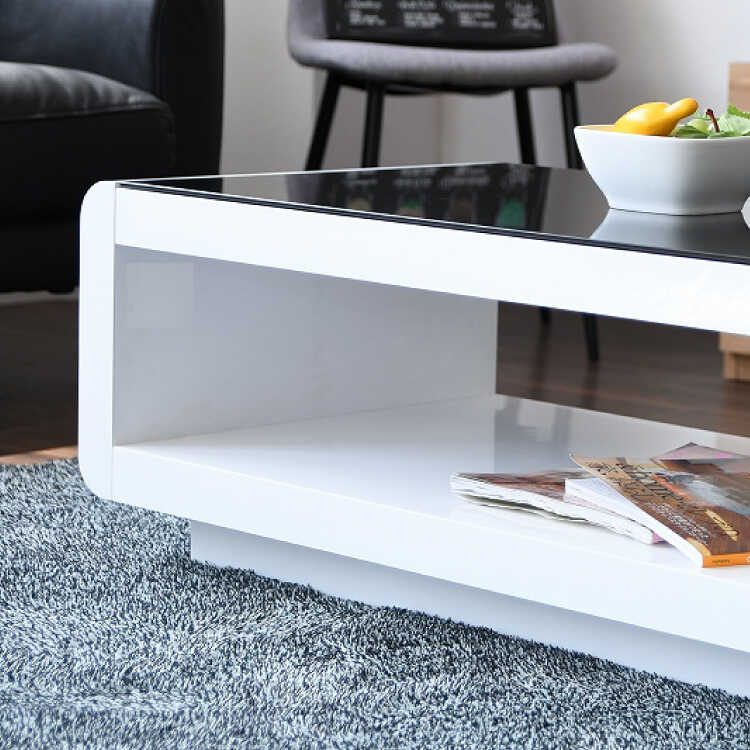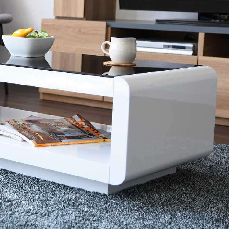 光沢ホワイトの本体ボディーにブラックガラスを乗せたモダンなローテーブル。