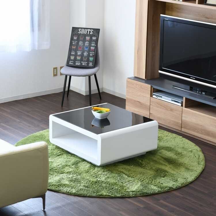 幅80cm・光沢ホワイトとブラックガラスの高級モダンローテーブル(完成品)